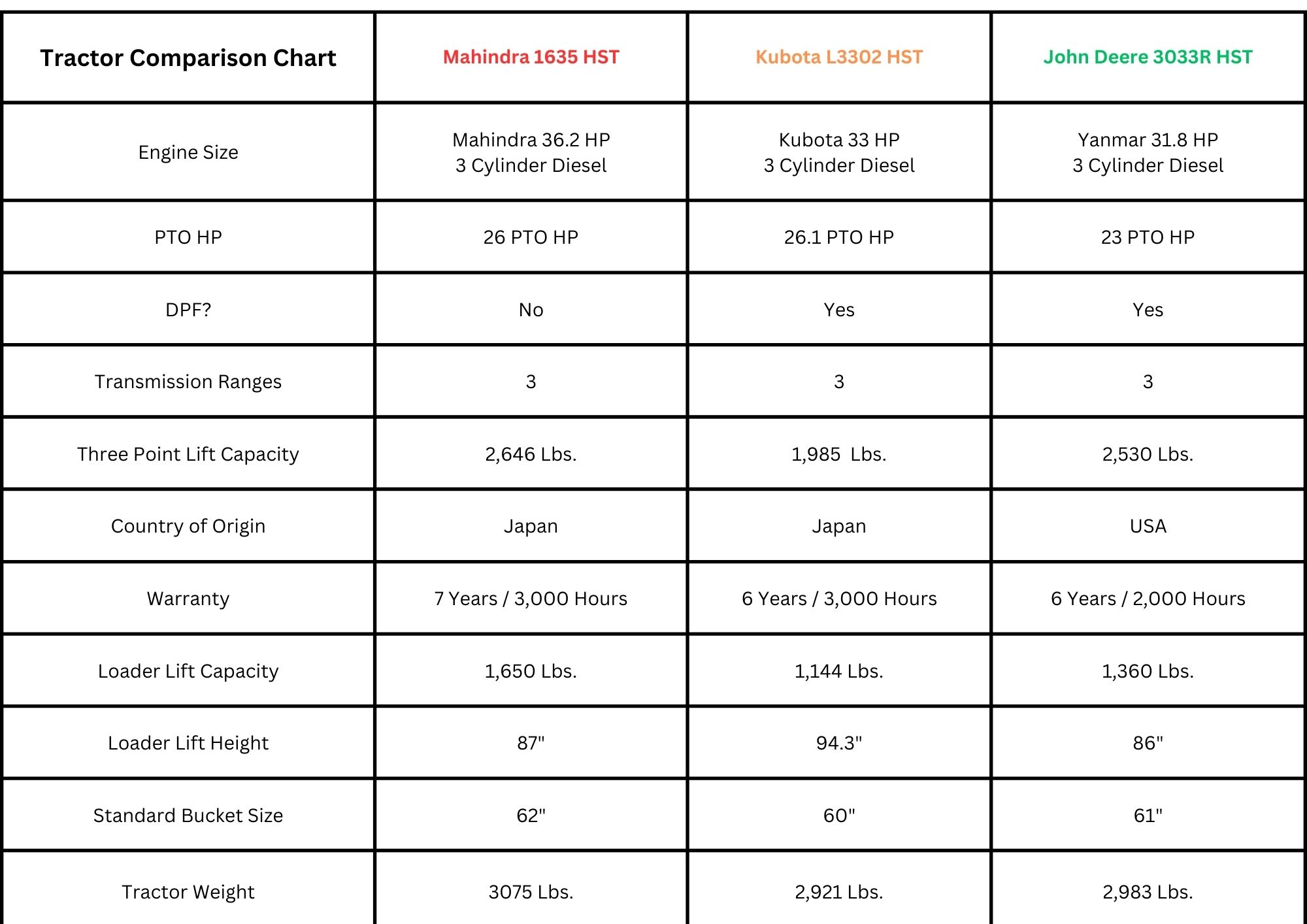 The 1635 HST has a three-range hydrostatic transmission and a tried and true 3-cylinder Mahindra diesel engine. The engine does not have a DPF (diesel particulate filter) and will never have to go into a regen cycle. Not having a DPF reduces fuel consumption, reduces complexity, reduces heat, and eliminates the risk of ever having to replace a costly DPF.